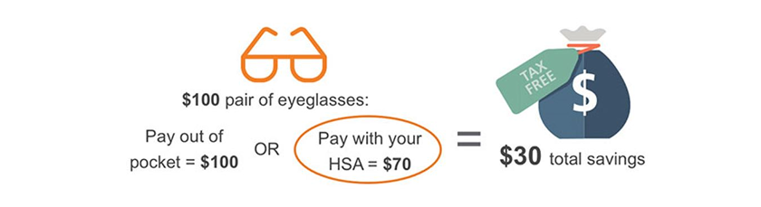 For a $100 pair of eyeglasses, you could pay $100 out of pocket, or you could pay $70 with your HSA, which is tax-free money. That's a savings of $30.